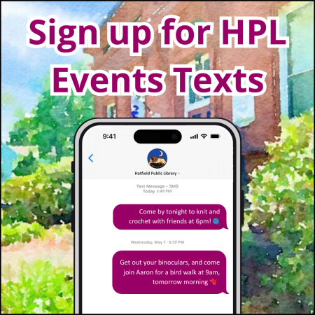 39 Main Street, Hatfield, Massachusetts • 413-247-9097 • hatfieldpubliclibrary@gmail.com • Open Hours: Tues/Thurs 10-5 • Wed/Fri 1-7 • Saturday 9-1 • Curbside by request